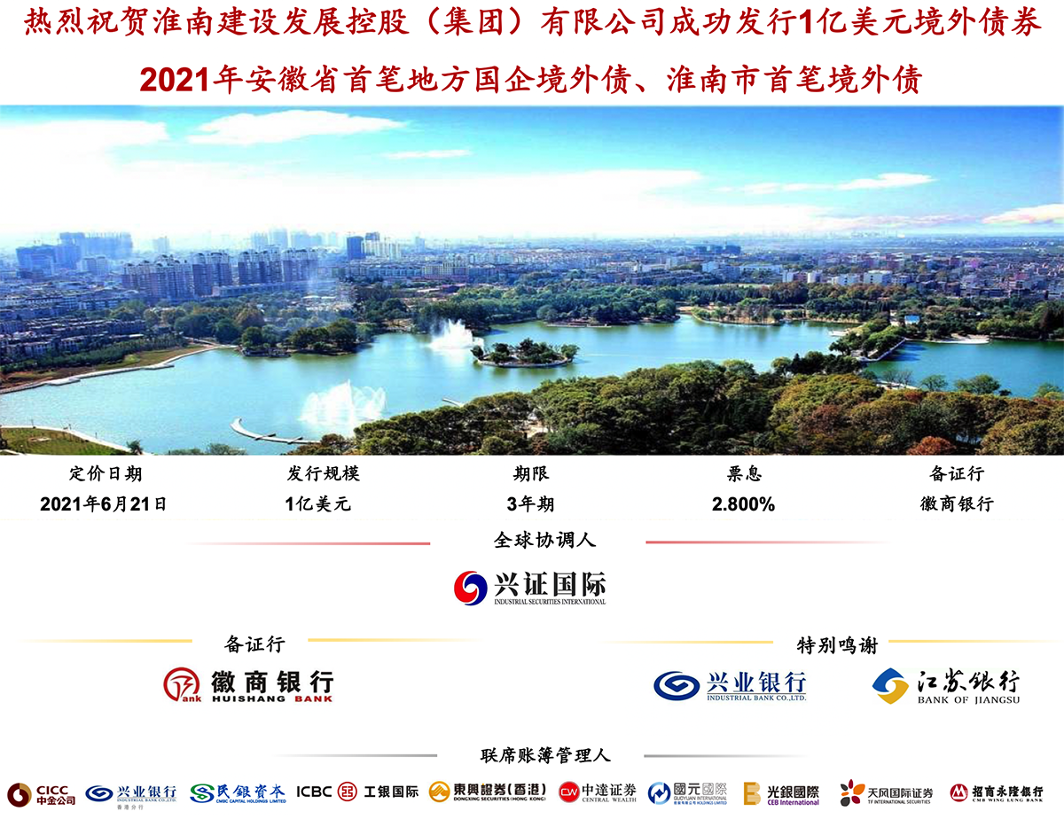 6月21日,建發(fā)集團(tuán)成功定價發(fā)行首期1億美元境外債券,期限3年,票面利率2.8%,由徽商銀行提供備證。本期債券為2021年安徽省首筆地方國企境外債、淮南市首筆境外債。